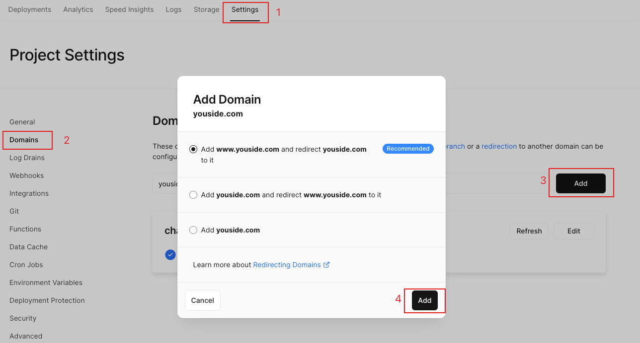 - 跳转到 vercel,选择你的项目,依次添加域名。